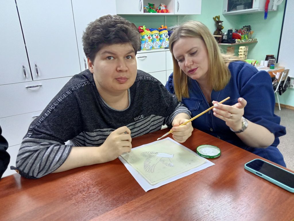 Участники мастер – класса, каждый на своем лоскутке акриловыми красками рисовали голубя, как символ мира, добра, благости вести и прекращения конфликтов.