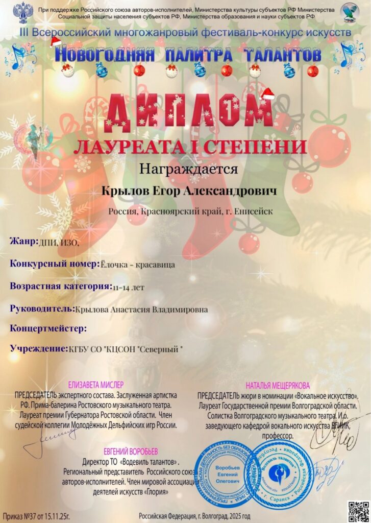 Получатель услуг КГБУ СО «КЦСОН «Северный» Крылов Егор стал Лауреатом I степени в номинации «ДПИ, ИЗО» в III Всероссийском многожанровом фестивале – конкурсе «Новогодняя палитра талантов», выставив работу «Ёлочка-красавица», руководитель Крылова Анастасия.