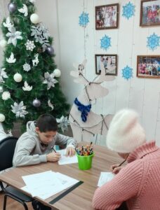 А зачем в коробке цветных карандашей находится белый карандаш? Этот вопрос активно обсуждали участники группы «Дневного пребывания» социально-реабилитационного отделения для граждан пожилого возраста, инвалидов и детей с ограниченными возможностями. Ведь для обычной белой бумаги белый карандаш действительно выглядит бесполезным! Но на занятии «Зимние забавы» выяснился секрет: белый карандаш незаменим, если рисовать на цветной бумаге — …